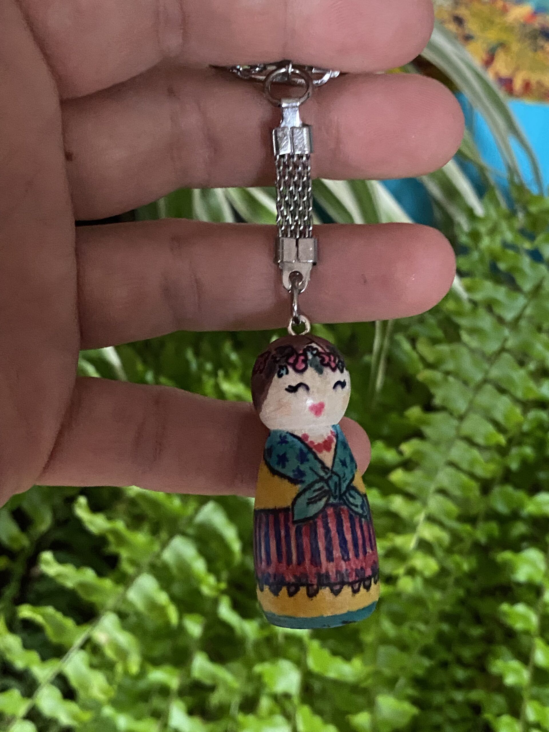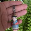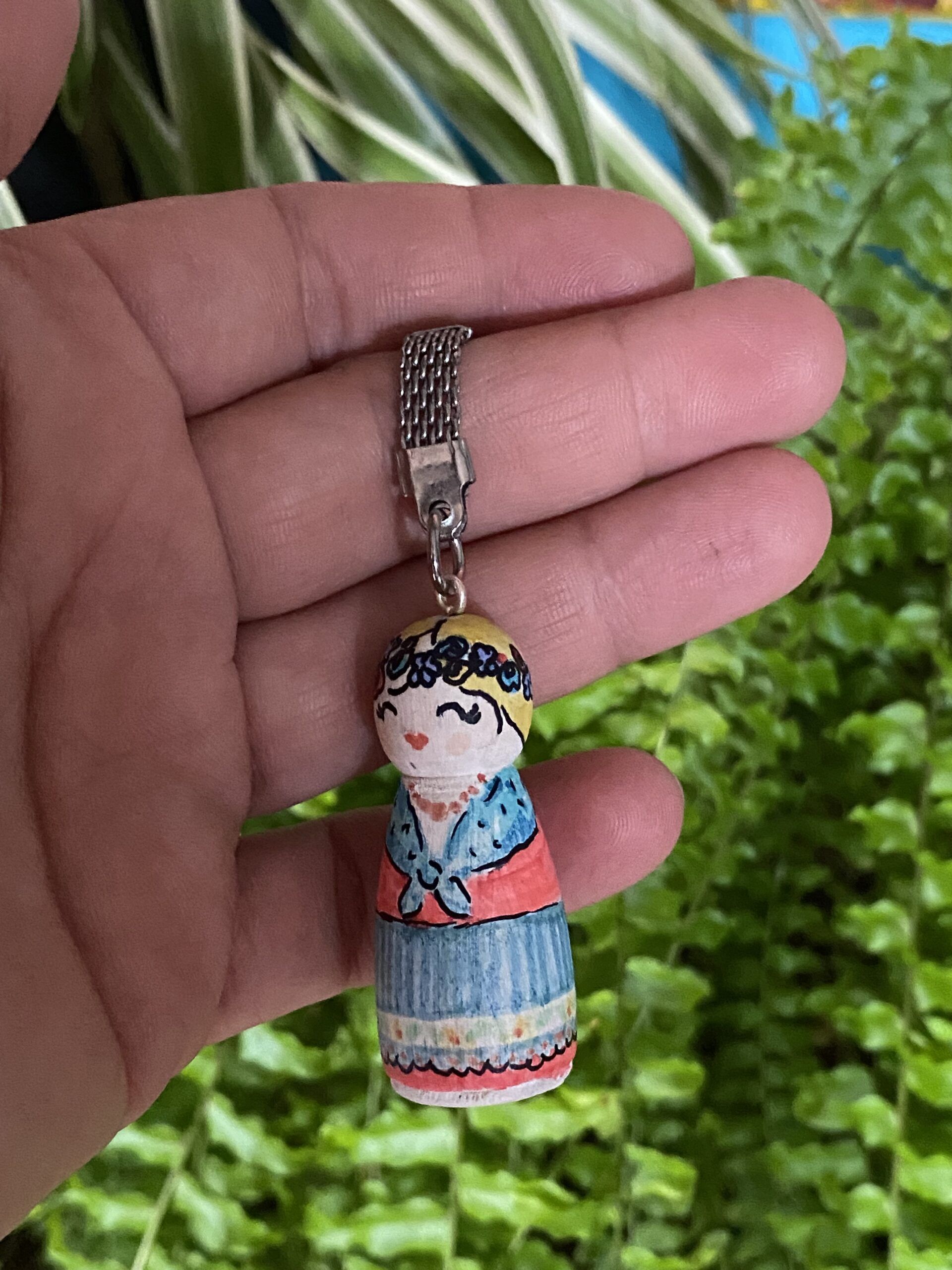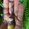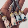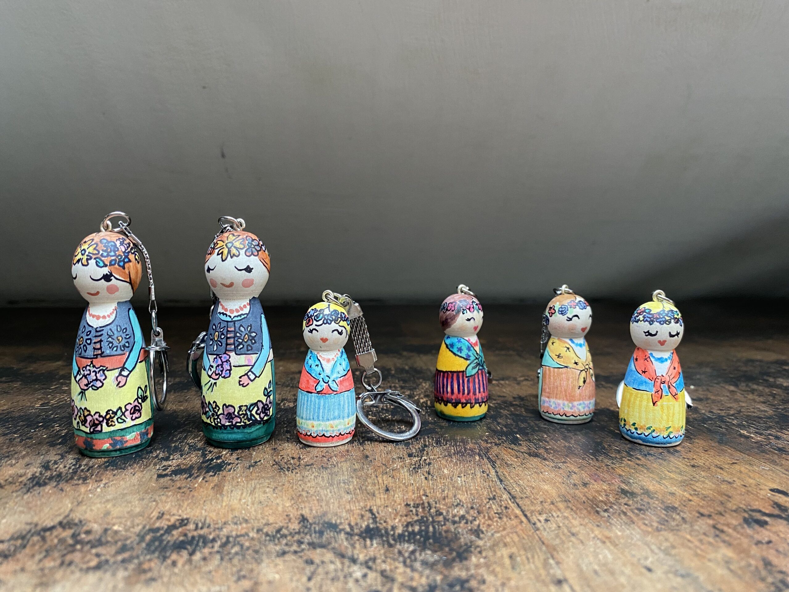 Drewniany brelok Karolinka, to ludowa laleczka malowana ręcznie.