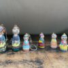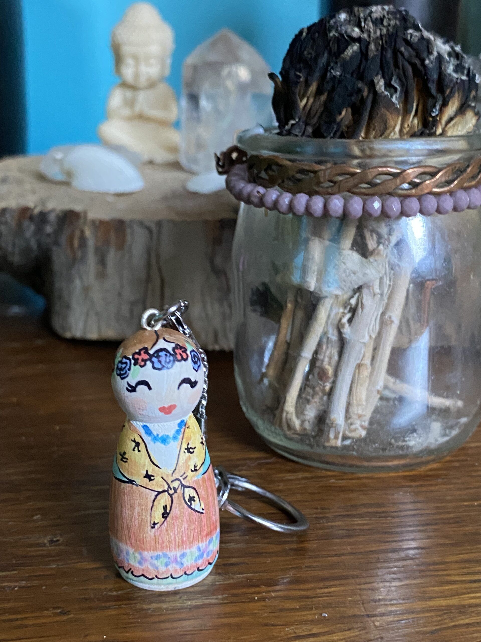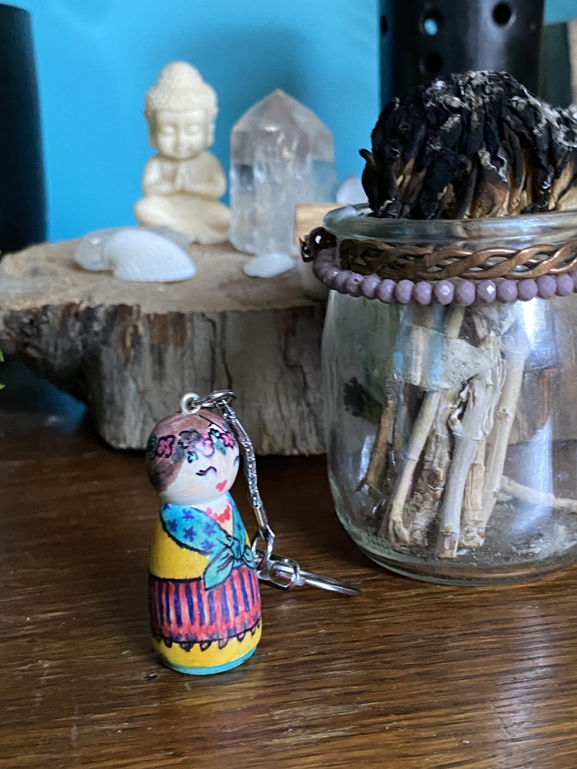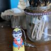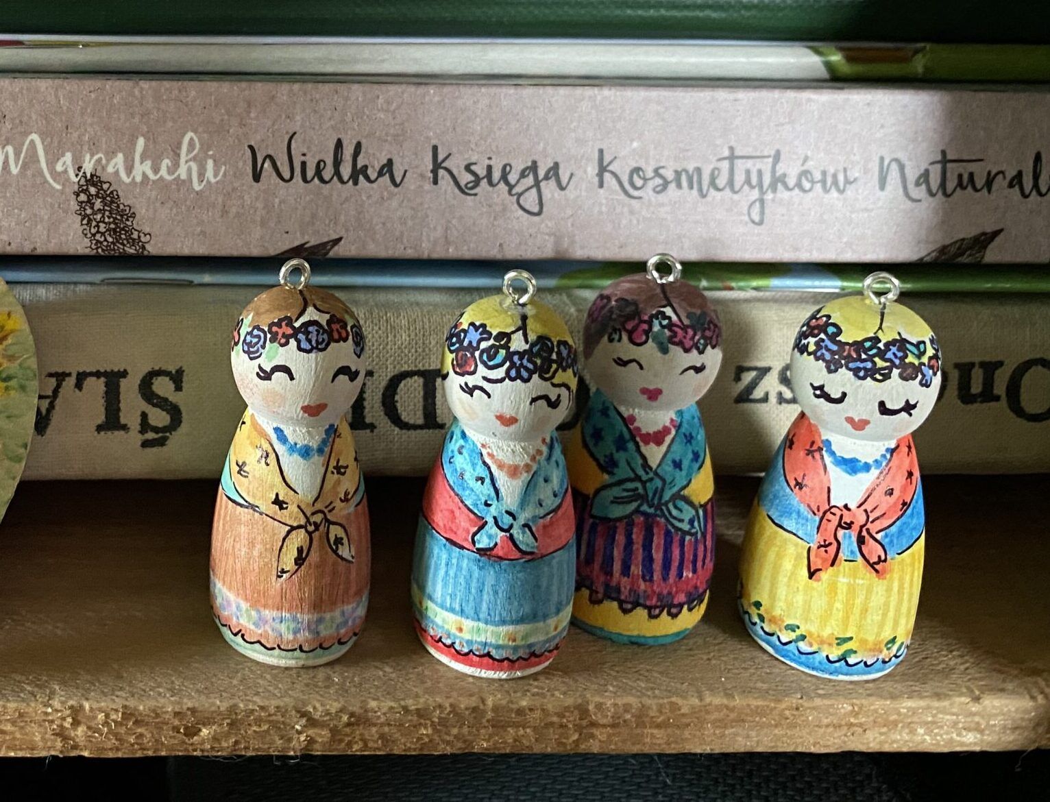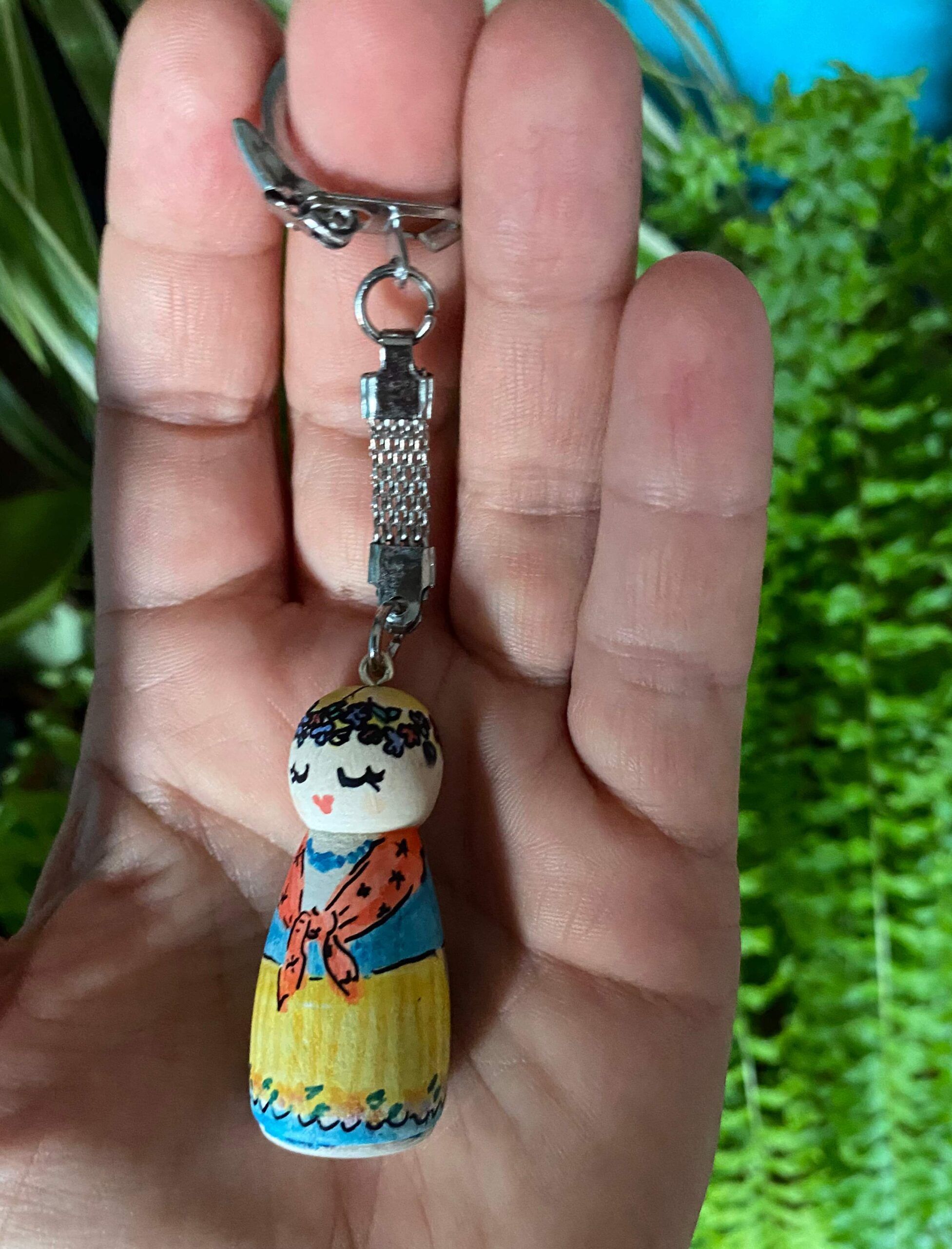 Drewniany brelok Karolinka, to ludowa laleczka malowana ręcznie.